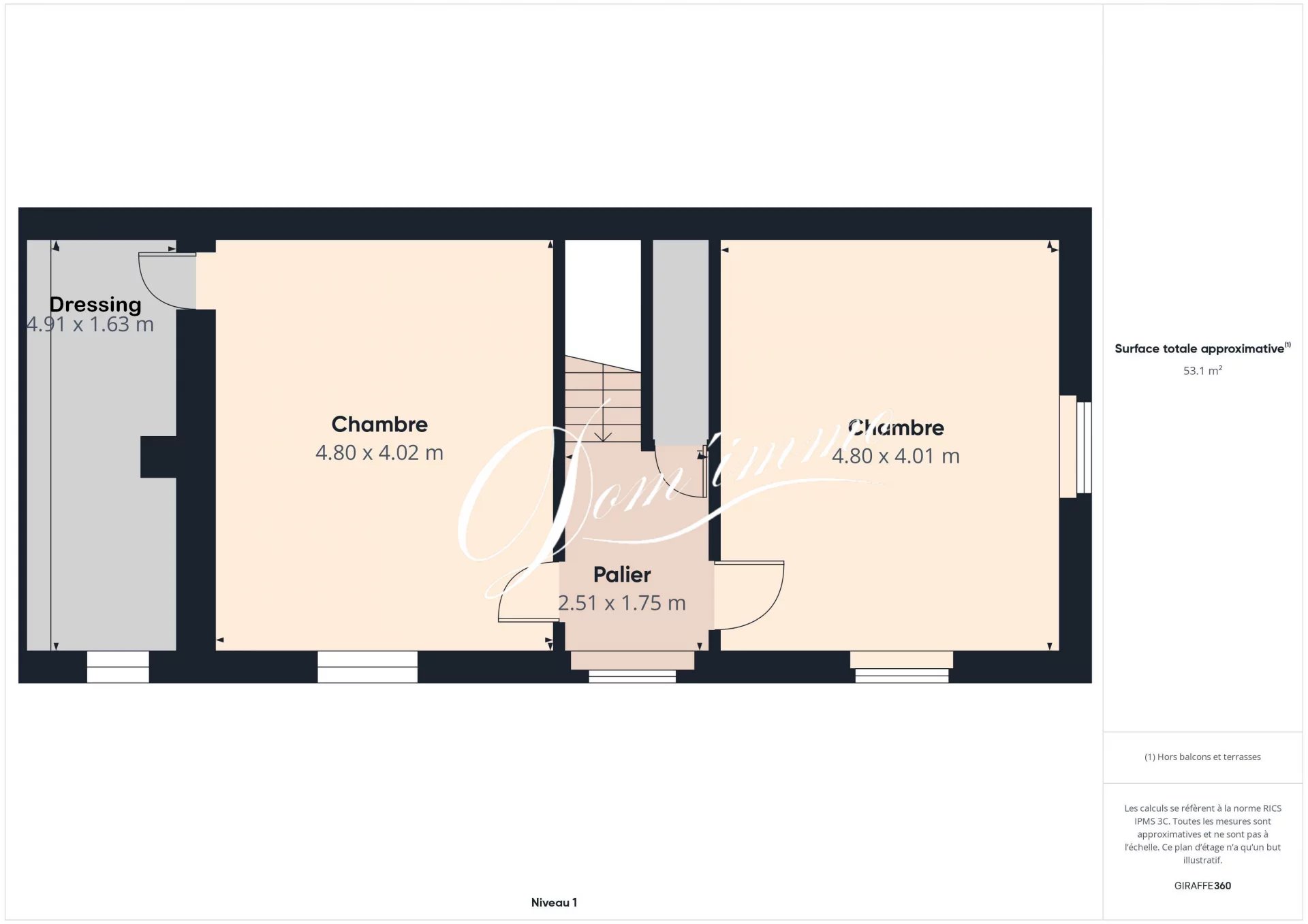 Au premier étage: palier desservant une première chambre avec dressing offrant une surface de 19 m² environ avec sol parquet et cheminée marbre et la seconde chambre avec cheminée marbre et sol parquet également d'une surface de 19 m² environ.