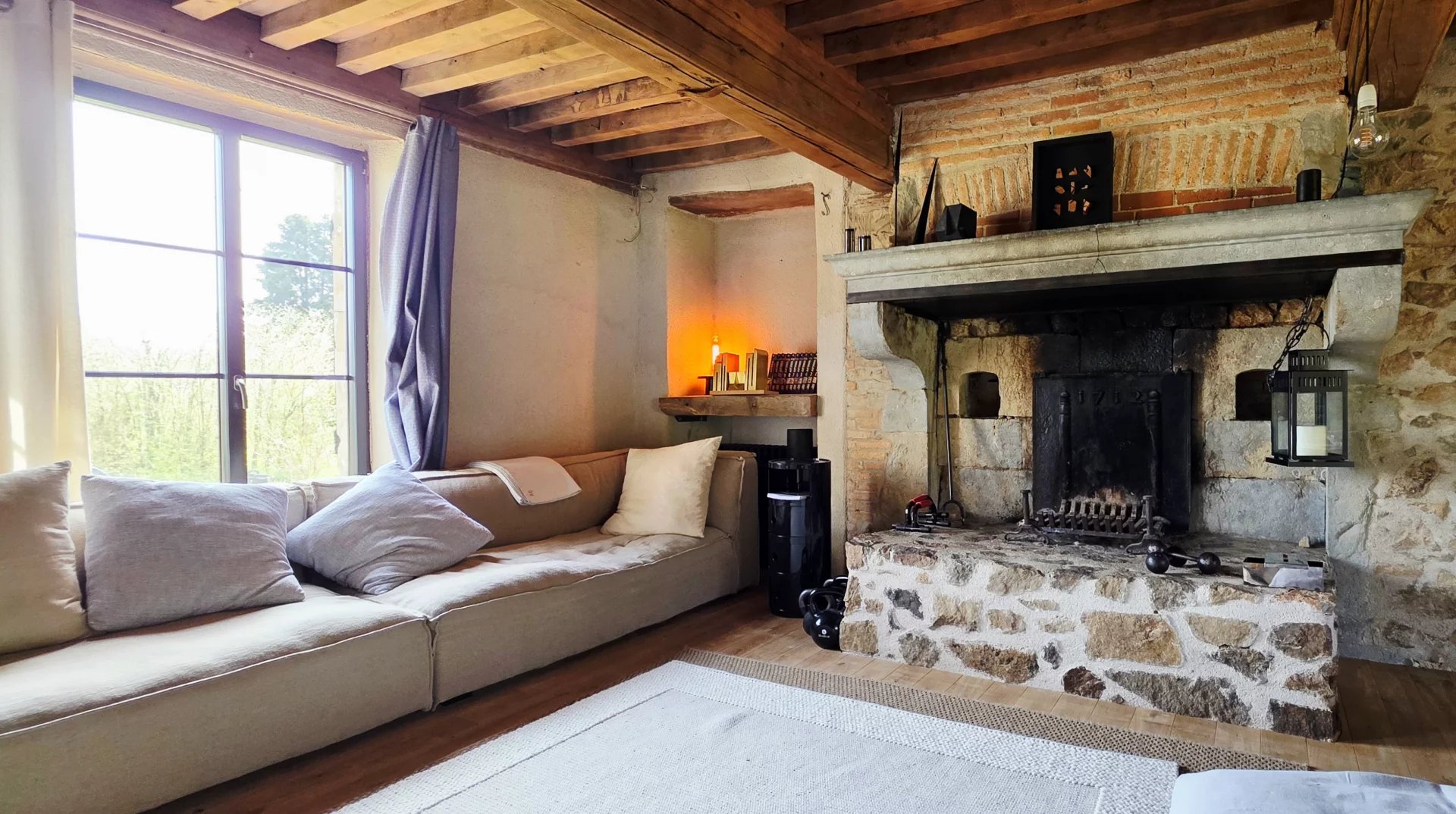 En traversant la cuisine, vous découvrez un séjour de 43 m² au charme préservé de l’ancien, avec plafond à la française, pierres apparentes, cheminée ouverte et baies vitrées en double exposition, offrant une belle luminosité. Une salle d’eau ainsi que des WC séparés se situent à l’arrière de la cuisine.