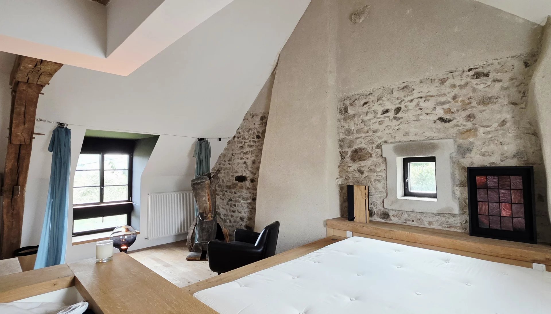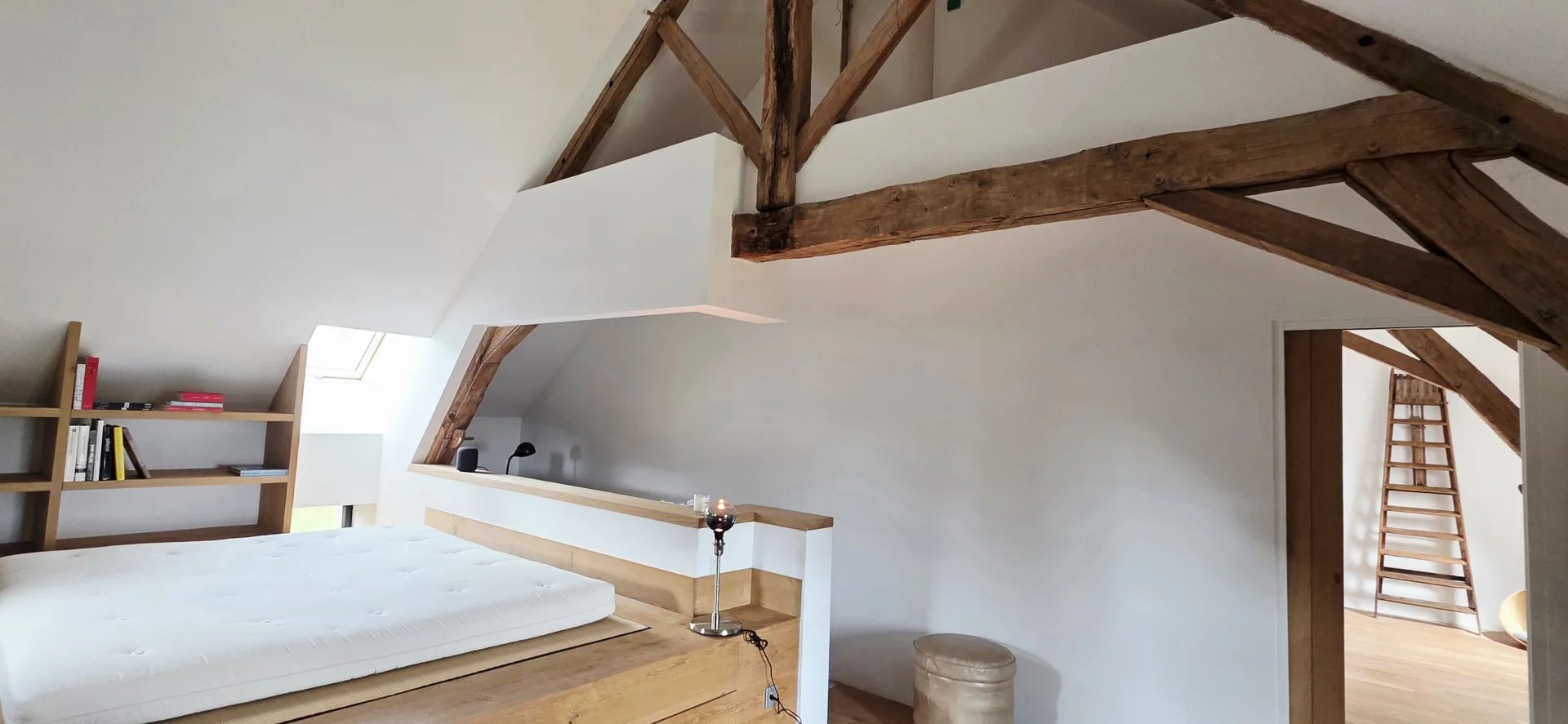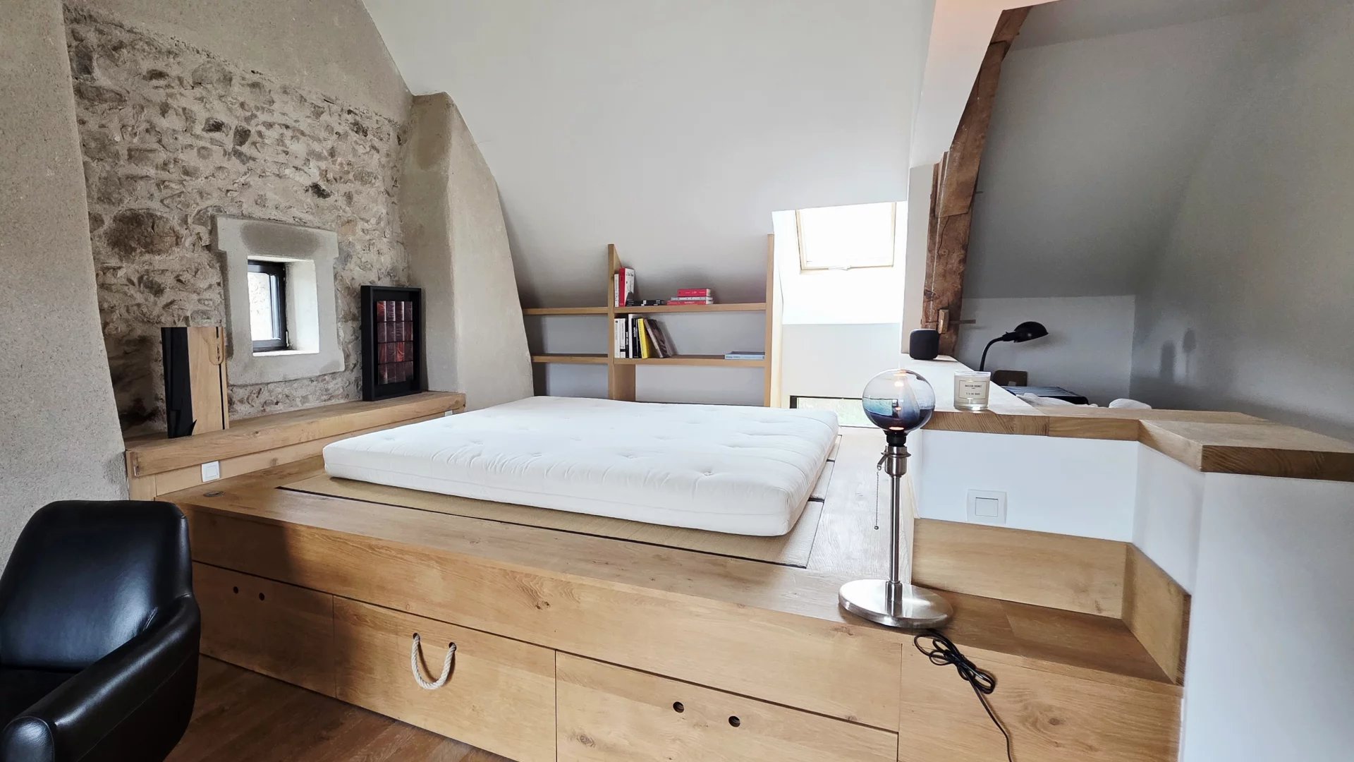 La deuxième chambre 26m2 est aussi avec des rangements en bois et lit tatami offre des éléments anciens, poutres et pierres apparentes, et sur le même palier la troisième chambre (22m2 facile à diviser en deux pièces si besoin).