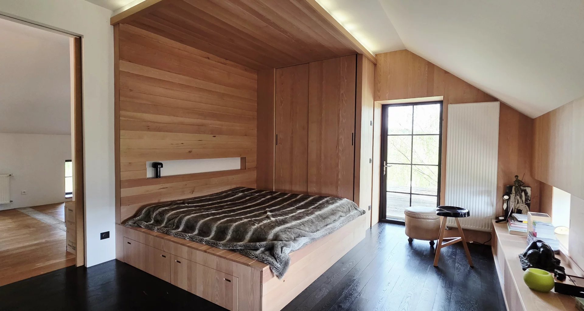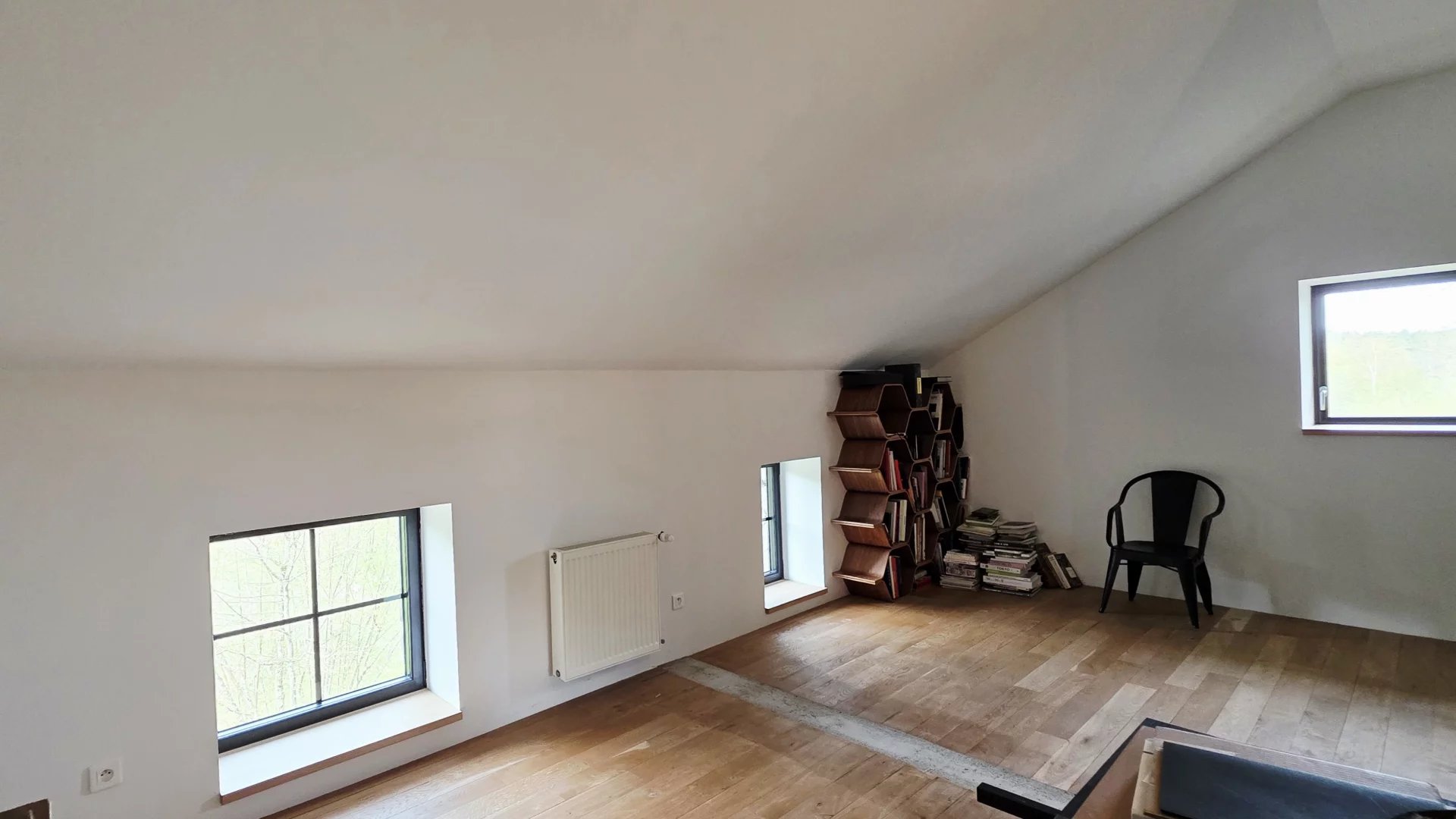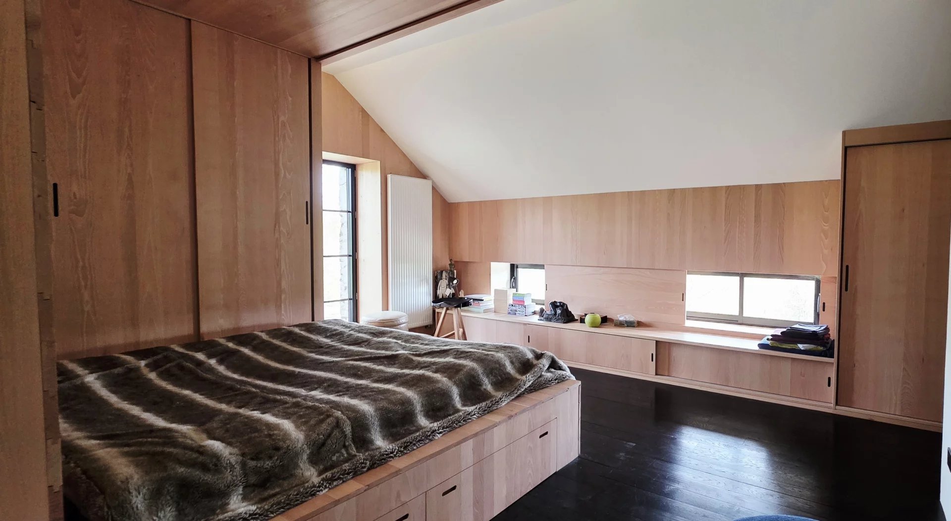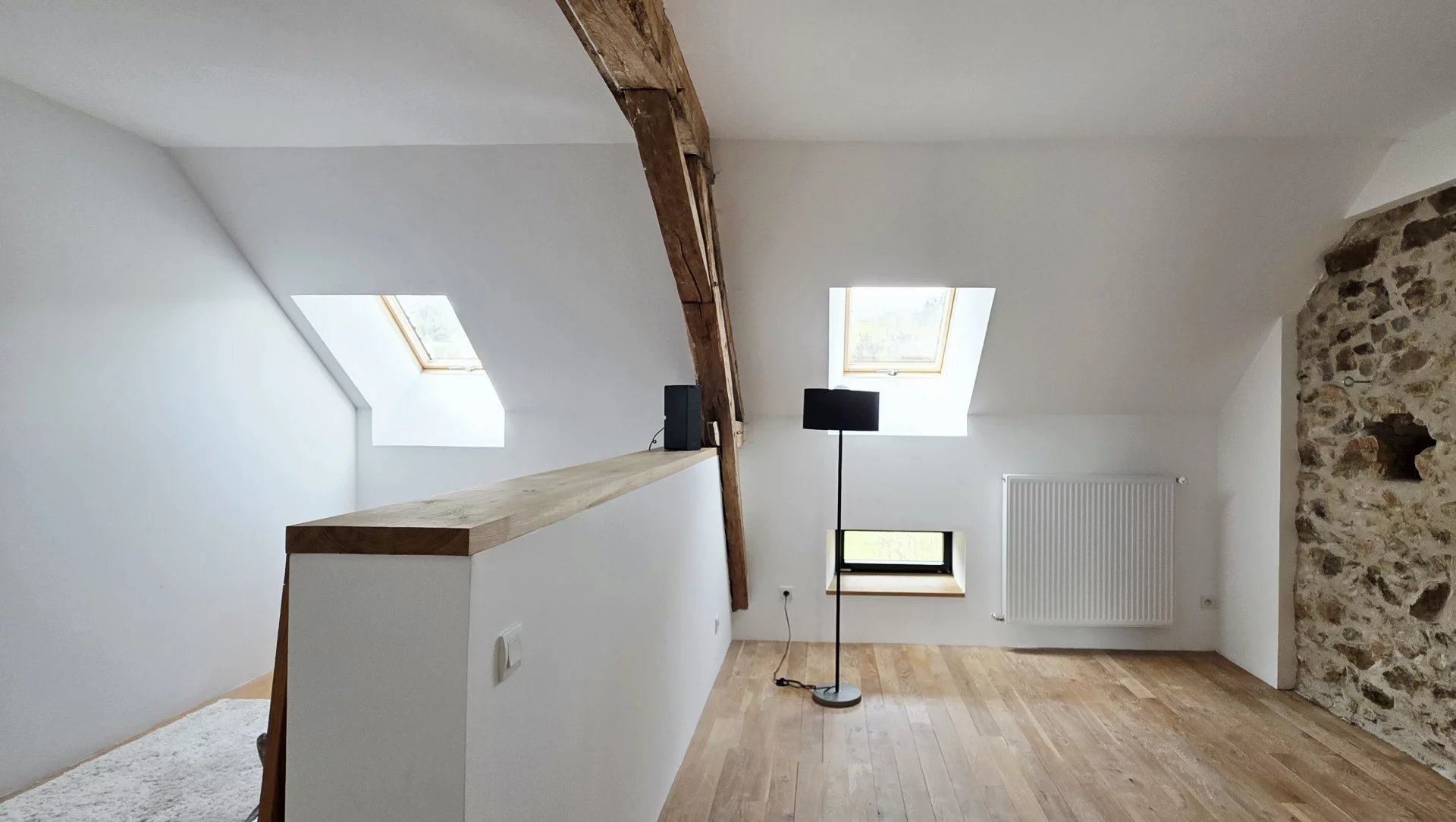 La deuxième chambre 26m2 est aussi avec des rangements en bois et lit tatami offre des éléments anciens, poutres et pierres apparentes, et sur le même palier la troisième chambre (22m2 facile à diviser en deux pièces si besoin).