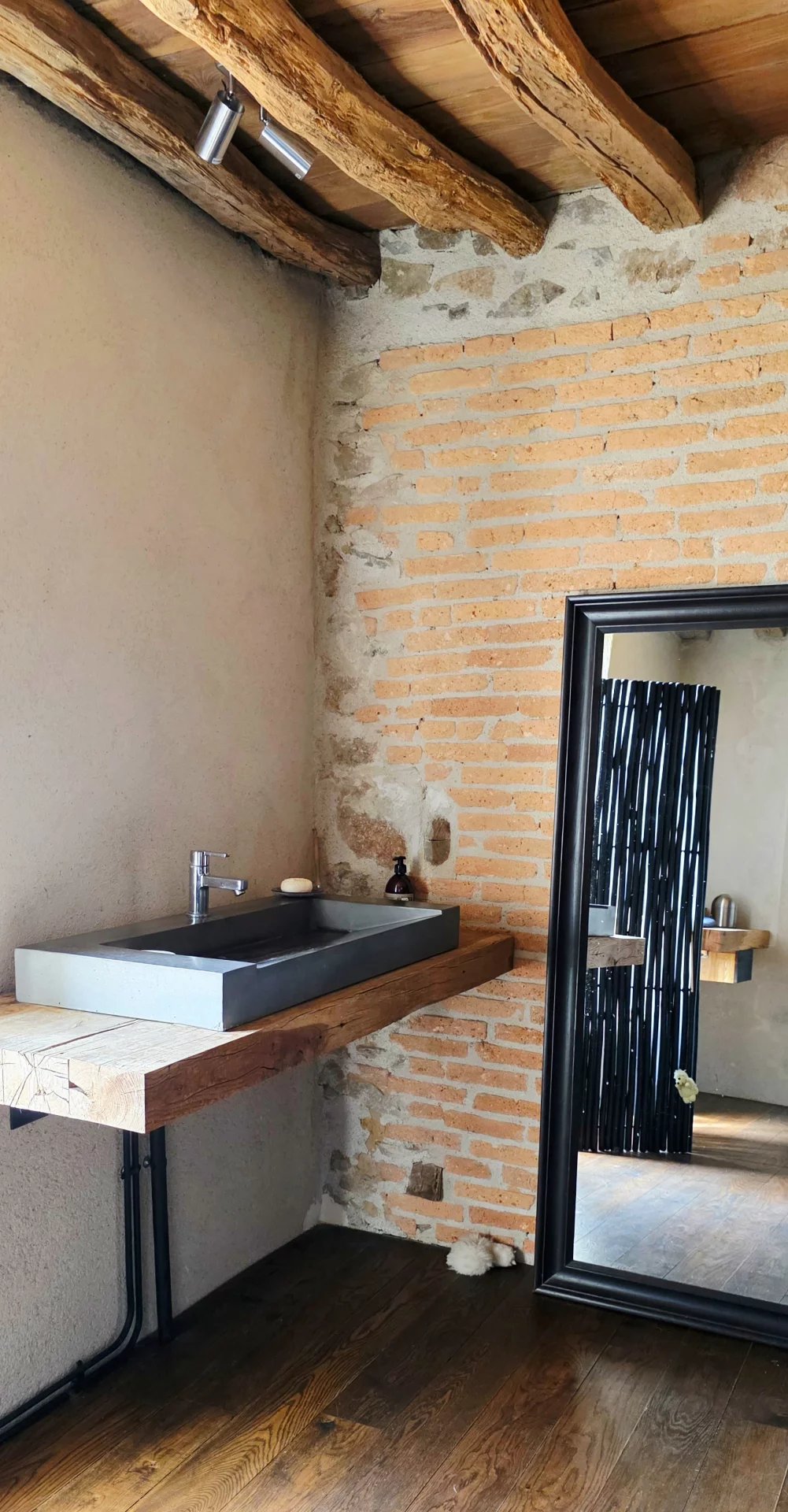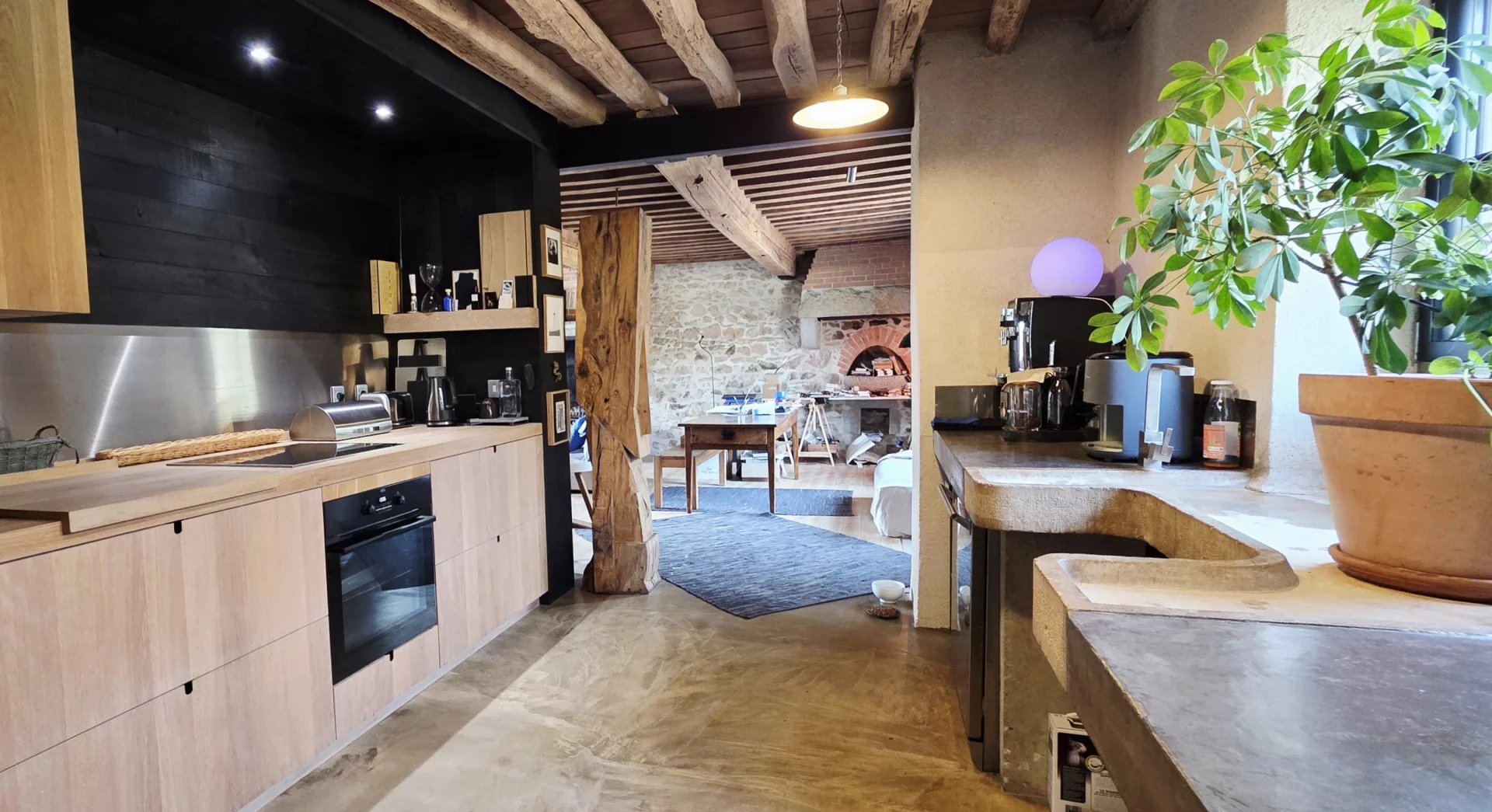 Dans le prolongement, la cuisine sur mesure en bois séduit par son authenticité et la qualité de ses matériaux : mobilier en bois, évier en pierre et sol en béton poli. Un second point d’eau est aménagé dans la pièce attenante.