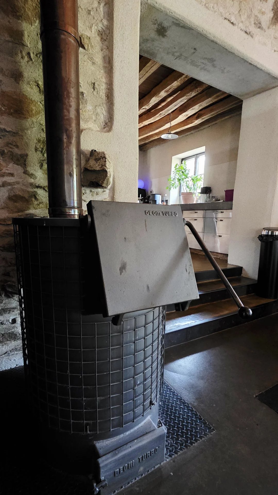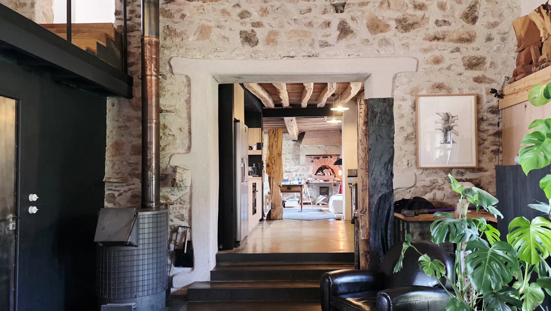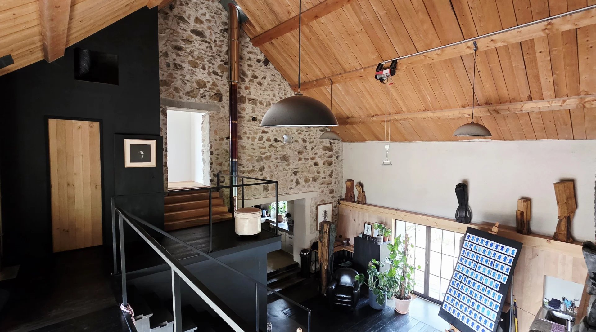 L’entrée s’ouvre sur une vaste pièce de vie aux volumes remarquables, sublimée par un plafond cathédral. Les matériaux mêlant béton et bois apportent un caractère contemporain, tandis que les larges baies vitrées en double exposition amènent de la lumière. Un poêle à bois Deom Turbo, à forte puissance de chauffe, complète cet ensemble. La chaufferie (chauffage central au fioul) y est également intégrée, avec un accès direct à trois caves. Actuellement utilisée en atelier, cette pièce offre un fort potentiel pour devenir une élégante salle à manger ou une chaleureuse pièce familiale.