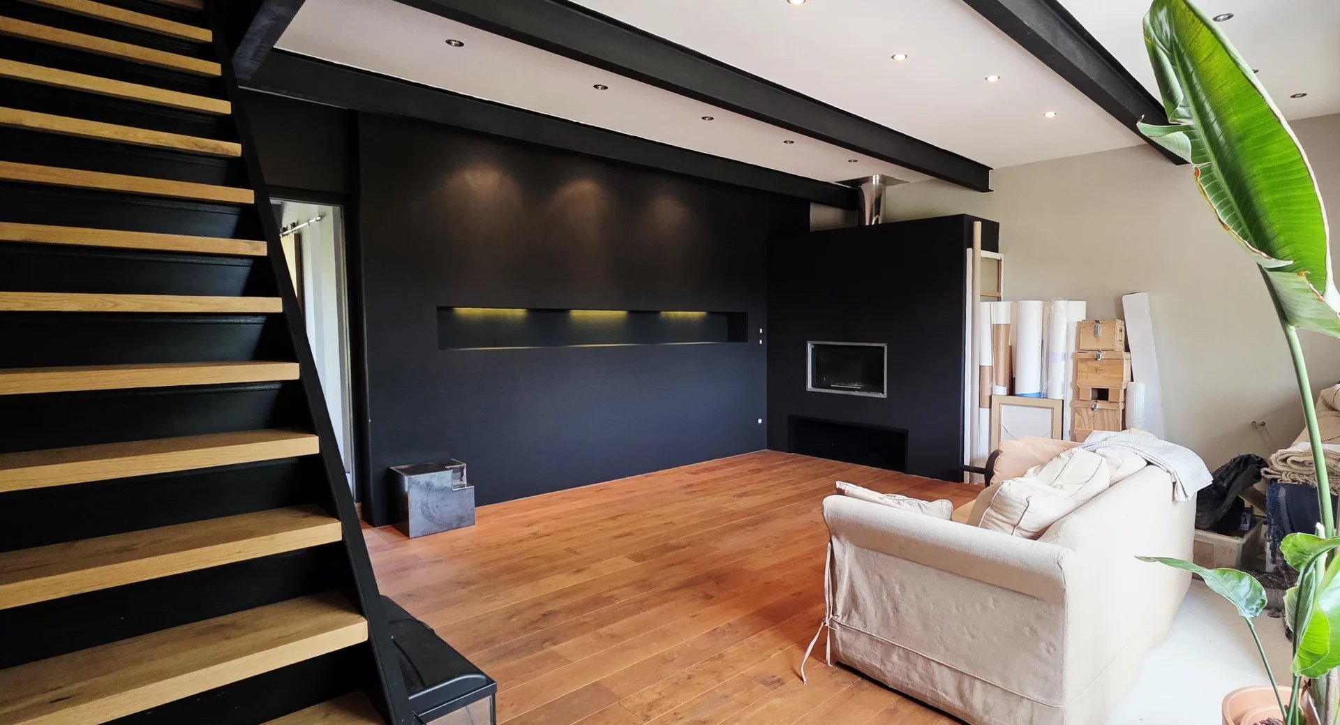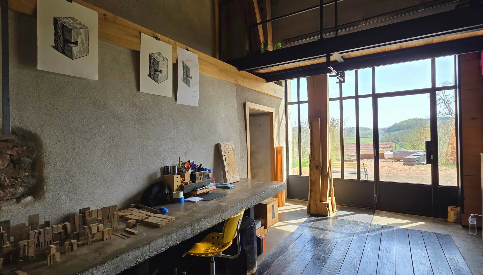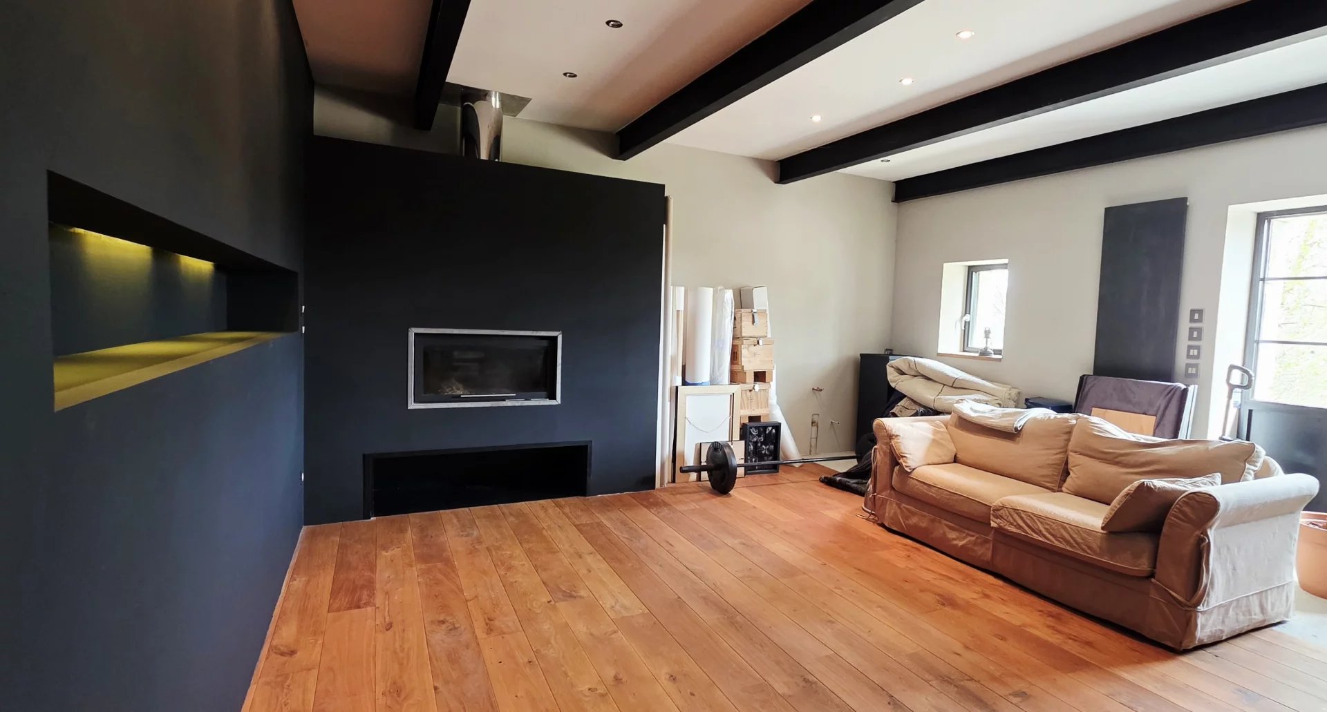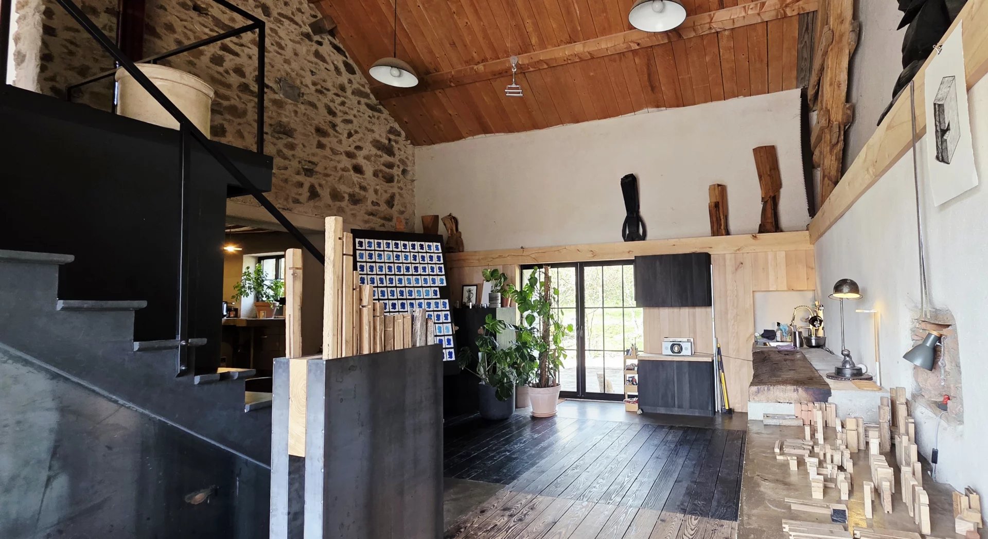 L’entrée s’ouvre sur une vaste pièce de vie aux volumes remarquables, sublimée par un plafond cathédral. Les matériaux mêlant béton et bois apportent un caractère contemporain, tandis que les larges baies vitrées en double exposition amènent de la lumière. Un poêle à bois Deom Turbo, à forte puissance de chauffe, complète cet ensemble. La chaufferie (chauffage central au fioul) y est également intégrée, avec un accès direct à trois caves. Actuellement utilisée en atelier, cette pièce offre un fort potentiel pour devenir une élégante salle à manger ou une chaleureuse pièce familiale.